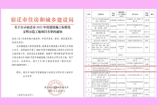 用心做好文明施工積極打造文明示范工地沭陽(yáng)縣臺(tái)州路改造工程(道路部分)獲評(píng)標(biāo)準(zhǔn)化文明示范工地 3月21日,宿遷市住房和城鄉(xiāng)建設(shè)局公布了2022年度建筑施工標(biāo)準(zhǔn)化文明示范工地項(xiàng)目,集團(tuán)承建的沭陽(yáng)縣臺(tái)州路改造工程(杭州路至珠海路)(道路部分)工程獲評(píng)。 2022上半年,工程曾榮獲江蘇省省級(jí)星級(jí)標(biāo)準(zhǔn)化安全文明工地。項(xiàng)目部始終貫徹落實(shí)集團(tuán)創(chuàng)優(yōu)工作,對(duì)安全文明工地進(jìn)行提前策劃,施工過(guò)程嚴(yán)格按照質(zhì)量標(biāo)準(zhǔn)管理,本次宿遷市建筑施工標(biāo)準(zhǔn)化文明示范工地申報(bào)工作,項(xiàng)目部及上級(jí)單位高度重視、提前組織、精心準(zhǔn)備,也充分展現(xiàn)了集團(tuán)安全文明施工的管理水平和企業(yè)文化。 接下來(lái),項(xiàng)目部將堅(jiān)定不移地推行施工工藝標(biāo)