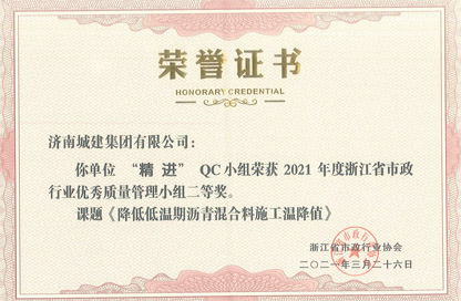浙江省市政行業優秀質量管理小組二等獎