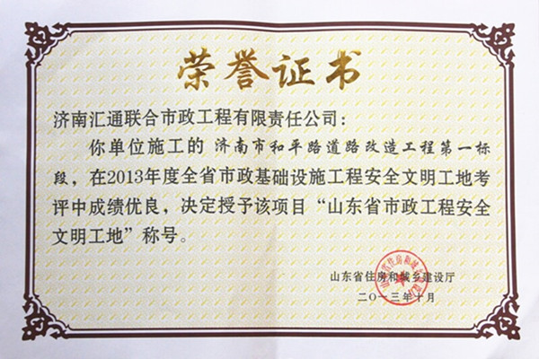 公司近年來先后承建了濟南經十路道路及環境建設工程、濟南市興濟河截污工程、濟南市北園高架橋工程、濟南市奧體中心市政工程、濟南市二環東路及BRT系統建設工程、蕪湖市赭山路改造工程、濟南市西區大學路工程、大明湖路改造工程、小清河綜合整治工程、濟南市文化路道路改造工程、濟南市西客站片區市政工程、濟南市二環西路、二環南路改造工程、濟南市工業北路快速路建設工程、北園大街快速路西延建設工程、淄博市正陽路南延工程、南通東快速路工程、連云港珠江路高架橋梁(鐵路跨線橋梁)工程、藍翔路藍翔中路道路改造工程、順河南延玉函路隧道工程、順河南延103隧道工程、220國道長清段改擴建工程等一大批省市重點工程,多項工程榮獲“國家優質工程獎”、“全國市政金杯示范工程”和“山東省建筑質量泰山杯工程”、“山東省市政金杯示范工程”等榮譽稱號,其中濟南市經十路道路及環境建設工程榮獲國家建設工程質量最高獎——魯班獎。江蘇省南通市東快速路建設工程、山東省濟南市二環南路建設工程榮獲國家優質工程獎。施工質量及現場安全文明、環保及工期進度均得到各級領導、建設單位及社會周邊相關單位一致好評,取得了較好的社會效益和經濟效益,社會美譽度逐年提升,被授予“山東省優秀市政工程施工企業”。